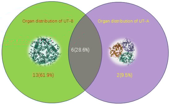 The three-dimensional structure of UT-A (right) and UT-B (left), Venn diagrams of the organs where UT-A and UT-B are mainly distributed. UT-A is mainly distributed in kidneys, hearts, brain, liver, large intestine, testes, ears and eyes; UT-B is mainly distributed in erythrocyte, endothelium, kidneys, colon, small intestine, cecum, heart, brain, spleen, testicles, bone marrow, prostate, bladder, thymus, skeletal muscle, lungs, pancreas, gastric glands andeyes. (The structure of proteins UT-A and UT-B was obtained from UNIPROT, https://www.uniprot.org, accessed on 13 July 2025). Venn diagram was performed by venny2.1 (https://bioinfogp.cnb.csic.es/tools/venny/, accessed on 26 October 2025).