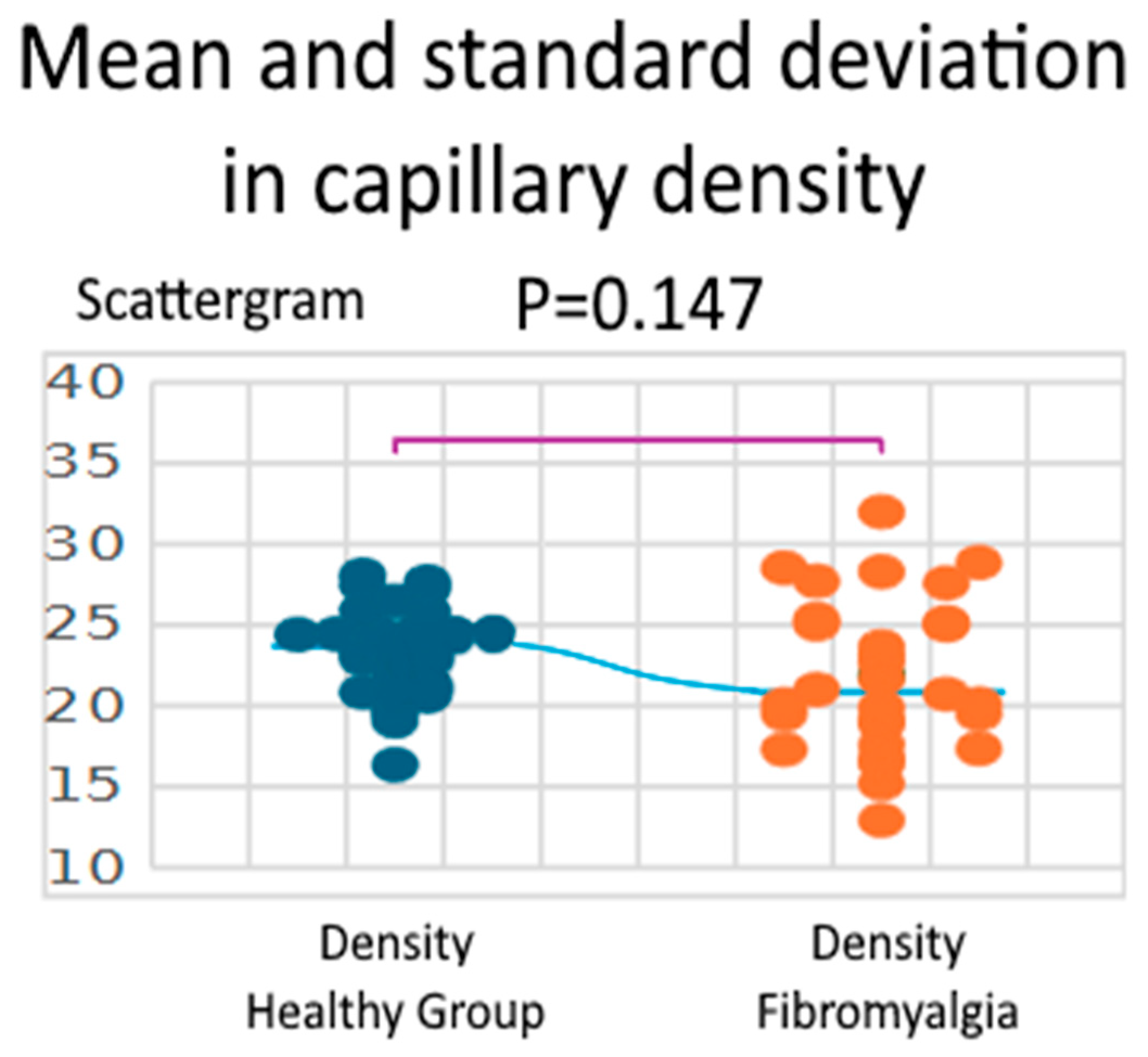 Capillary density did not differ significantly between groups. Healthy controls showed a mean density of 23.37 ± 2.81 loops/mm2, while patients with fibromyalgia had a mean of 21.91 ± 4.66 loops/mm2. The Shapiro–Wilk test confirmed normal distribution in both groups (W = 0.975, p = 0.675 for healthy controls; W = 0.974, p = 0.643 for fibromyalgia). The independent two-sample t-test, assuming equal variances, revealed no significant difference between groups (t = 1.469, df = 58, p = 0.147; 95% CI: −0.53 to 3.45 loops/mm2). While the group difference was not statistically significant, the effect size (Hedges’ g = 0.380) suggests a small-to-medium difference in capillary density (Figure 3).