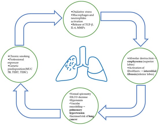 In the upper lobes, excessive destruction of the alveolar septa through the activation of proteases and α1-antitrypsin deficiency favors the development of emphysema [13]. In the lower lobes, repeated alveolar injuries and the release of profibrotic cytokines lead to the activation and differentiation of fibroblasts into myofibroblasts, a central mechanism in fibrogenesis [6,17].