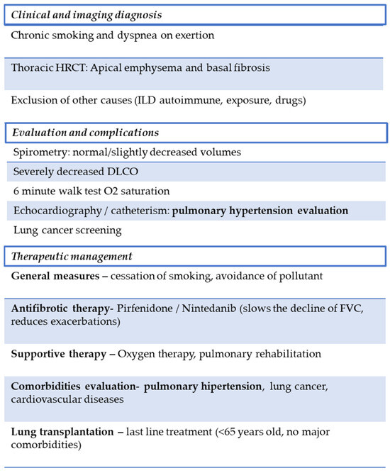 Proposed diagnostic and management flowchart for CPFE. The diagnostic process integrates clinical history, HRCT findings, and functional assessment. Management focuses on smoking cessation, antifibrotic therapy when appropriate, and treatment of major complications such as PH and lung cancer. A multidisciplinary approach is essential to improve outcomes.