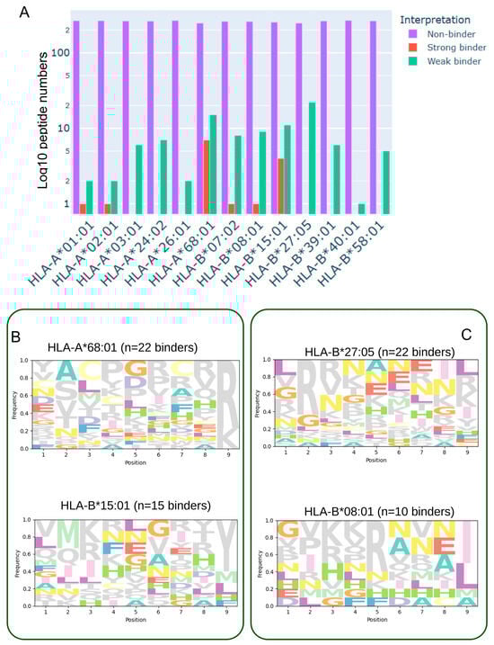 Comprehensive analysis of predicted peptide binding across twelve representative HLA class I supertypes revealed a predominant fraction of non-binding peptides, with a smaller subset exhibiting weak or strong binding affinities (Figure 1B). The overall binding distribution (Figure 2A) indicated that supertypes such as HLA-A68:01 and HLA-B15:01 generated higher counts of strong binders, whereas alleles including HLA-A01:01, HLA-A02:01, and HLA-B*40:01 were largely dominated by non-binders. Notably, binding profiles varied considerably between HLA alleles, suggesting allele-specific differences in the capacity to present glioblastoma-associated neoepitopes. Sequence motif analysis (Figure 2B,C) further highlighted these differences: panel B illustrates alleles such as HLA-B15:01 and HLA-A68:01, which are enriched in strong binders and display conserved anchor residue motifs at position 2 and the C-terminus; in contrast, panel C shows alleles such as HLA-B27:05 and HLA-B08:01, which exhibit a more heterogeneous binding landscape with both strong and weak binders represented. These findings emphasize the heterogeneity of neoantigen presentation in glioblastoma and suggest that HLA allele-specific binding preferences may influence T-cell recognition and, ultimately, the efficacy of immunotherapeutic interventions.