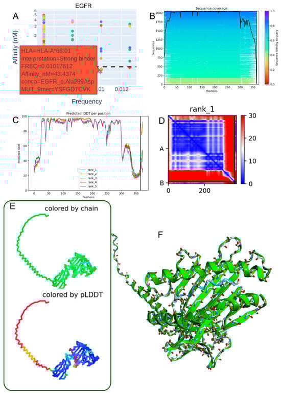 Structural modeling of the EGFR p.Ala289Asp-derived peptide in complex with HLA-A*68:01. (A) Predicted binding affinity (in the low nanomolar range) indicating strong interaction between the EGFR p.Ala289Asp peptide (YSFGDTCVK) and the HLA-A*68:01 allele. (B) Sequence alignment from the mmSeq2s database showing conserved regions across homologous proteins. (C) Per-residue IDDT confidence scores for the top five ranked structural models. (D) Contact map of the top-ranked model highlighting intramolecular interactions at the peptide–HLA interface. (E) Two-dimensional structural representation colored by chain or pLDDT score, with model reliability ranging from red (low confidence) to blue (high confidence). (F) Three-dimensional visualization of the heterodimer colored by chain, illustrating molecular topology.