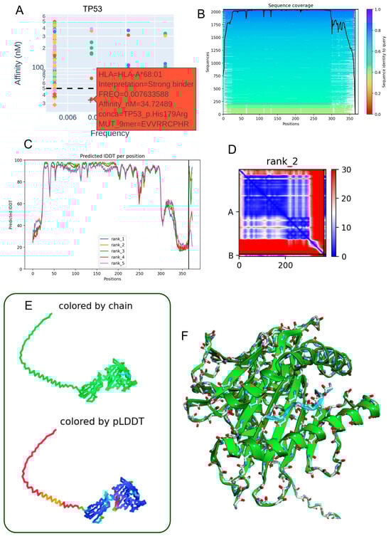 Predicted three-dimensional structure of the heterodimer formed between the TP53 p.His179Arg mutant-derived peptide and the HLA-A68:01 molecule. (A) The TP53 p.His179Arg peptide (EVVRRCPHR) exhibits a low allelic frequency and a strong predicted binding affinity (34.72 nM) to the HLA-A68:01 allele, suggesting a stable interaction. (B) Sequence alignment highlights conserved regions between the mutant peptide and homologous sequences retrieved from the mmSeq2s database. (C) Per-residue IDDT scores for the top five ranked structural models indicate high prediction reliability. (D) Contact map derived from the second-ranked model reveals key intramolecular residue interactions proximal to the mutation site. (E) Two-dimensional structural representation colored by chain or pLDDT score (ranging from red: low confidence to blue: high confidence), illustrating model robustness. (F) Three-dimensional visualization of the peptide–HLA complex, with chain-specific coloring depicting the molecular topology.