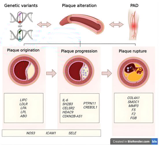 Recent genetic discoveries in PAD hold promise for translation into clinical practice. Several susceptibility loci, including SH2B3 and ABO, have been linked to PAD and may eventually be integrated into polygenic risk scores alongside conventional risk factors, thereby improving patient stratification and early detection []. Beyond risk prediction, these findings open up the possibility of precision prevention, where individuals at elevated genetic risk could benefit from earlier vascular screening (e.g., ankle–brachial index, Doppler ultrasound) and the more aggressive management of modifiable risk factors []. Furthermore, the identification of molecular pathways unique to PAD may provide novel therapeutic targets, paving the way for personalized interventions that differ from strategies typically applied to coronary artery disease or stroke []. Figure 1 represents the main associated genes in PAD.