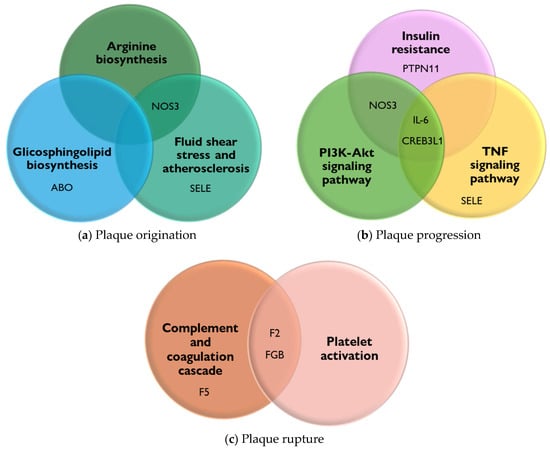 Finally, the pathways related to the plaque rupture stage allow for the integration of complement activation, coagulation cascade, and platelet activation, which are involved in exacerbating the inflammatory process, which, together with endothelial dysfunction promotes thrombosis. Genes such as F5, F2, and FGB are involved in these pathways (Figure 2c) [,].