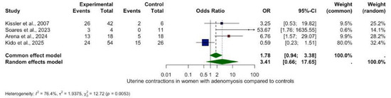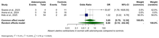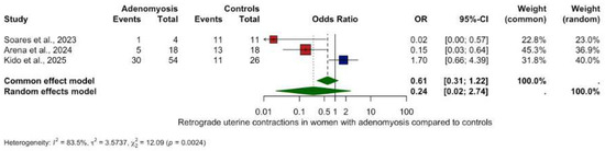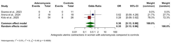 The only statistically significant directional finding was a reduction in antegrade contractions in women with adenomyosis (OR 0.35, 95% CI: 0.13–0.96, p = 0.0423) with low heterogeneity (I2 = 0.0%).