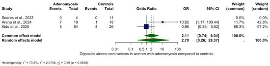 Figure 6. Opposite uterine contractions in women with and without adenomyosis [27,28,30]. For details see legend of Figure 2. - Random contractions: OR 4.32 (95% CI: 0.73–25.46, p = 0.1063).