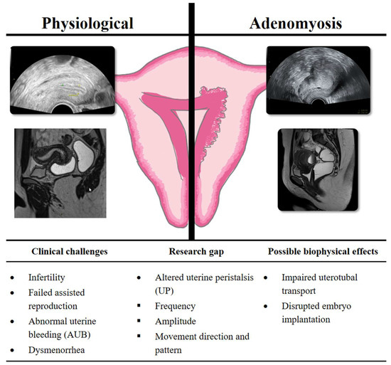 Impact of adenomyosis on uterine physiology, clinical challenges, and biophysical effects.