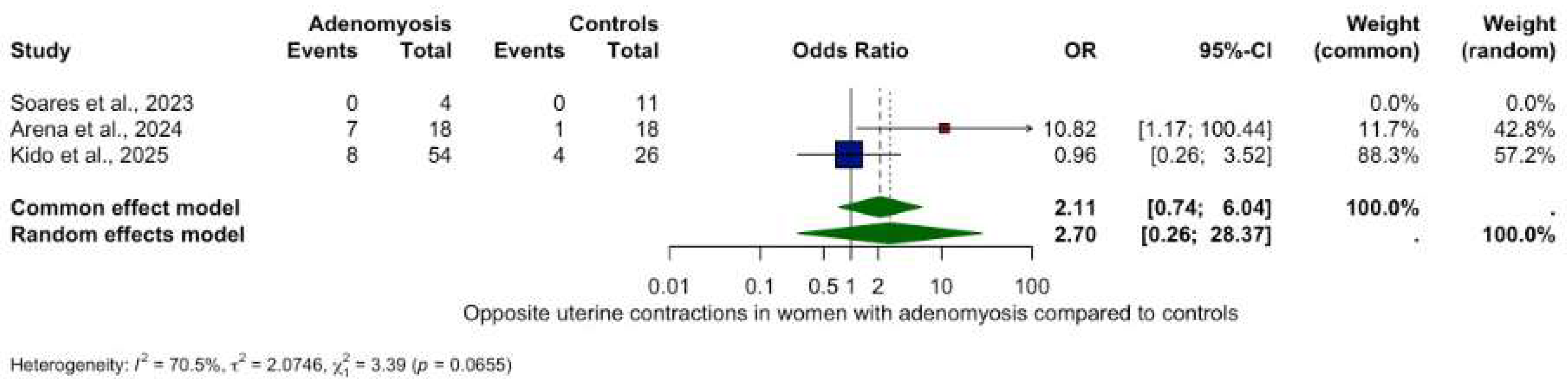 - Opposite contractions: OR 2.70 (95% CI: 0.26–28.37, p = 0.4079), (Figure 6).