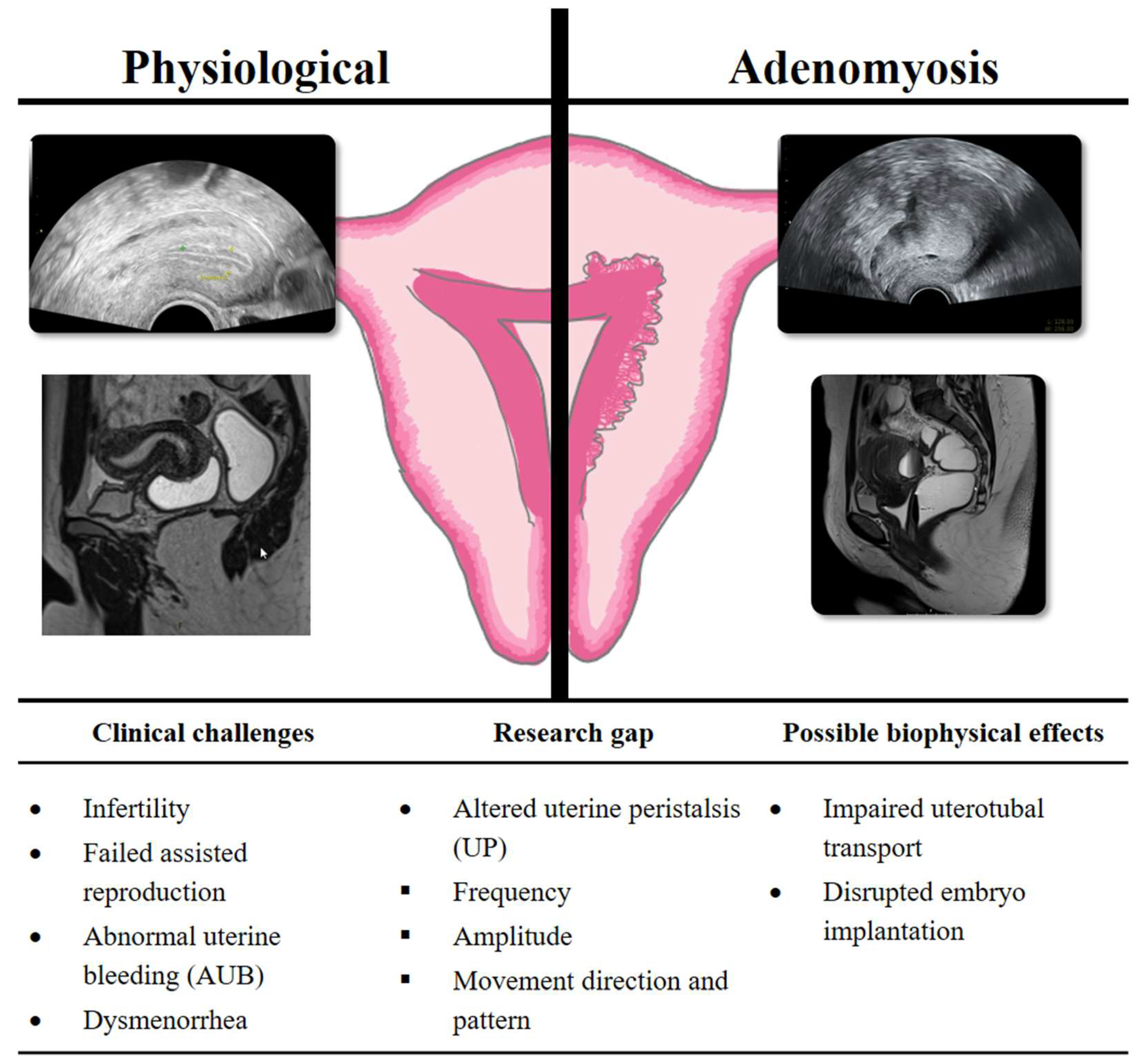 - Kido, A.; Ohta, I.; Himoto, Y.; Fujii, S.; Noguchi, K.; Nakamoto, Y.; Ogawa, T. Uterine Peristalsis of Adenomyosis Patients on Cine Magnetic Resonance Imaging. Int. J. Gynecol. Obstet. 2025, 170, 242–249. [Google Scholar] [CrossRef]