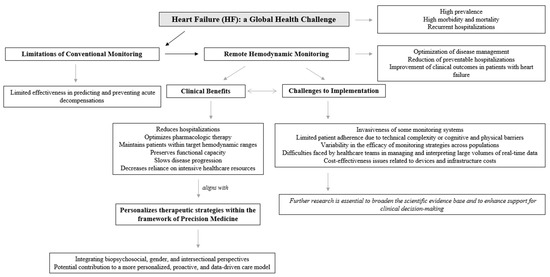 The discussion is organized to provide a comprehensive synthesis of current evidence and emerging challenges in the use of remote hemodynamic monitoring for heart failure management. It sequentially examines the differences between remote hemodynamic and non-hemodynamic monitoring, clinical rationale and impact on readmission prevention, integration with pharmacological and device-based therapies, implementation challenges, and patient-specific determinants of response. Subsequent sections address geographical and economic differences, biopsychosocial and gender-sensitive perspectives, data accuracy issues, and future research priorities, offering an integrated framework for clinical translation and policy development.
