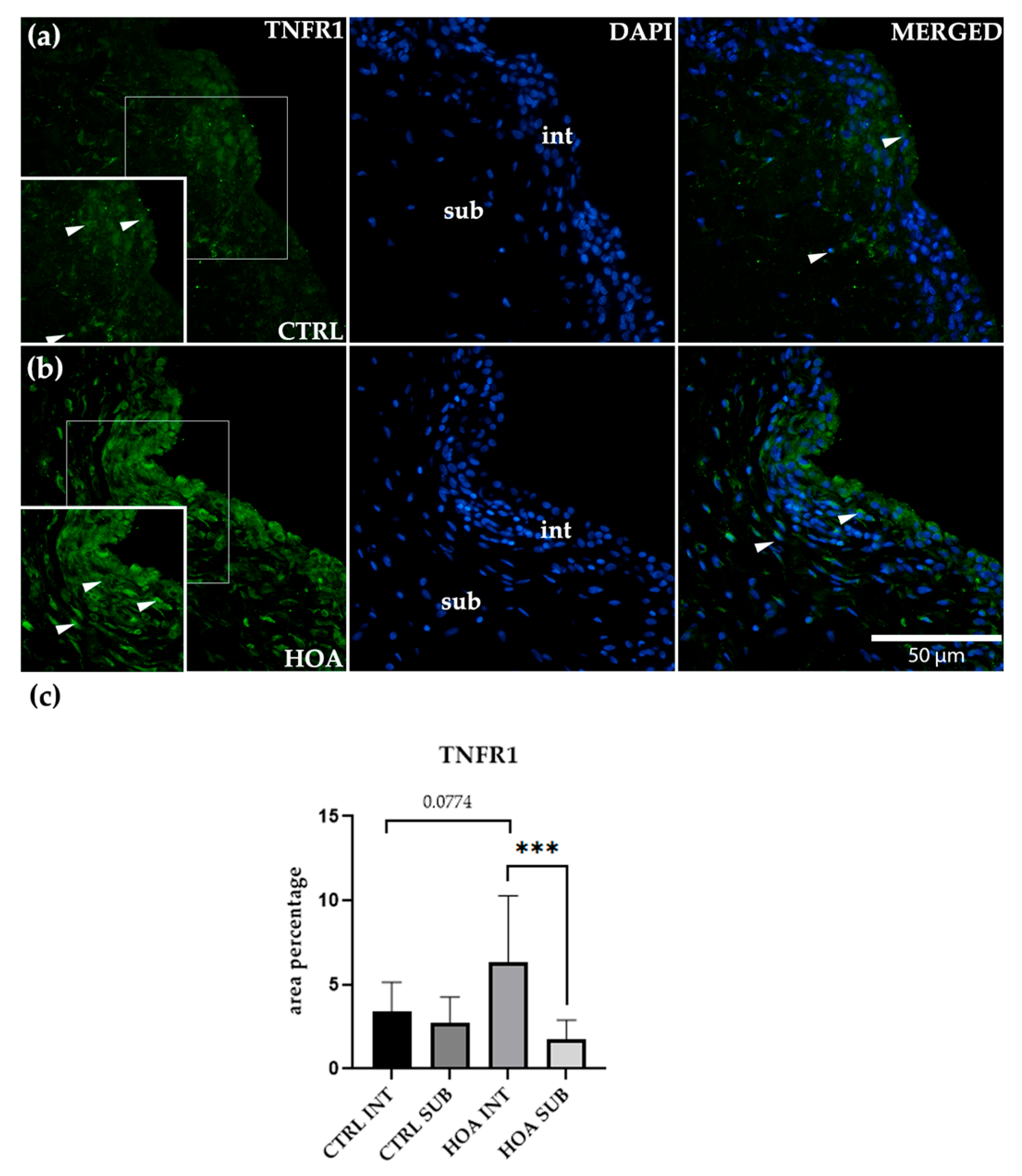 3.2. TNFR1 Is Predominantly Upregulated in the Intima of Hip Osteoarthritis Synovium