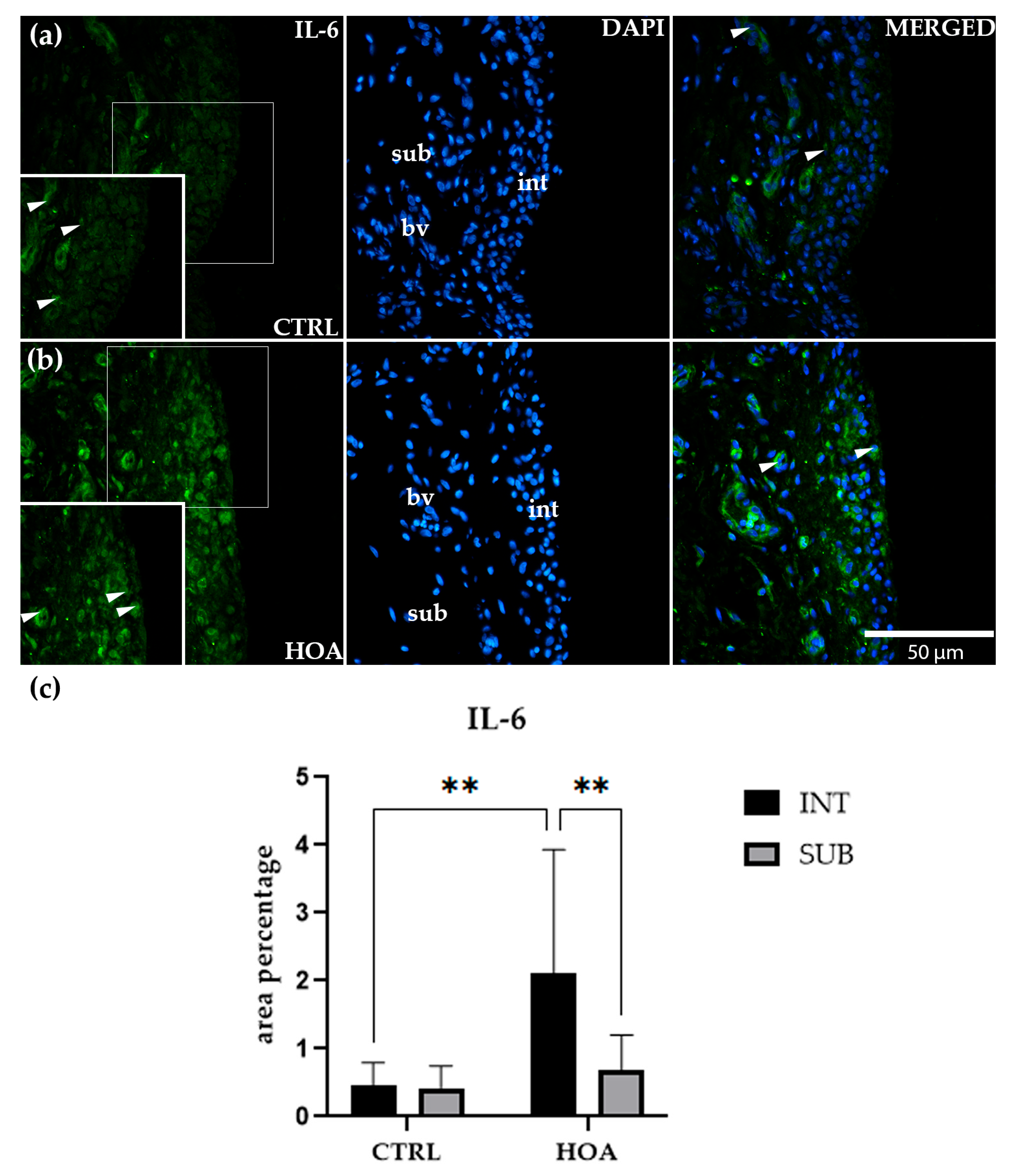 3.3. IL-6 Is Significantly Upregulated in the Intima of Hip Osteoarthritis Synovium