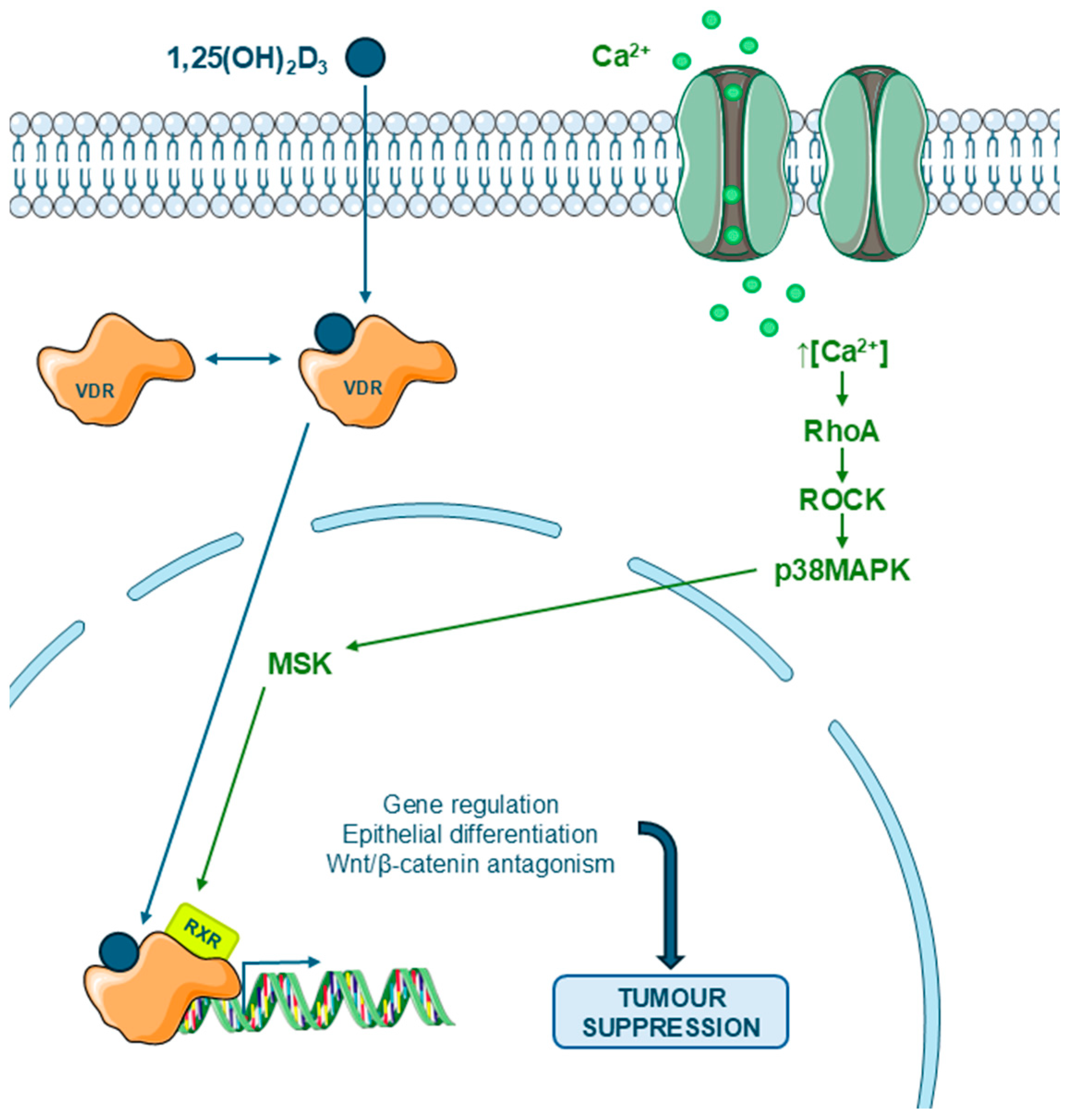- Ordóñez-Morán, P.; Álvarez-Díaz, S.; Valle, N.; Larriba, M.J.; Bonilla, F.; Muñoz, A. The effects of 1,25-dihydroxyvitamin D3 on colon cancer cells depend on RhoA-ROCK-p38MAPK-MSK signaling. J. Steroid Biochem. Mol. Biol. 2010, 121, 355–361. [Google Scholar] [CrossRef]
