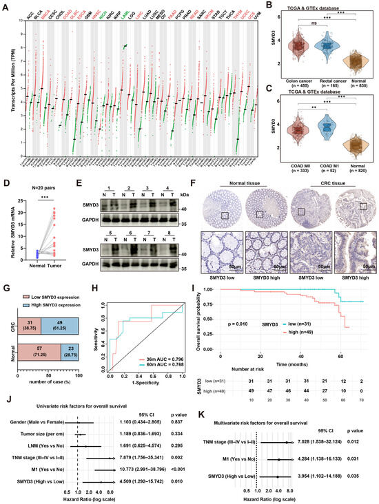 SMYD3 is upregulated in colorectal cancer and associates with metastasis and poor prognosis. (A) Pan-cancer landscape of SMYD3 mRNA (log2 [TPM+1]) across TCGA/GTEx cohorts; red dots indicate tumor, green dots indicate normal. (B) Violin plots of SMYD3 expression in colon cancer (n = 455), rectal cancer (n = 165) and normal colorectal tissues (n = 830) from TCGA/GTEx. *** p < 0.001; ns, not significant. (C) SMYD3 levels in TCGA-COAD stratified by metastatic status (M0, n = 333; M1, n = 52) versus normal (n = 820). ** p < 0.01, *** p < 0.001. (D) Relative SMYD3 mRNA in 20 paired tumors (T) and adjacent normals (N) by qPCR; lines connect pairs (*** p < 0.001). (E) Immunoblotting of SMYD3 in 8 matched pairs (N/T); GAPDH loading control; cases 1–4 (upper) and 5–8 (lower). (F) Representative immunohistochemistry (IHC) for SMYD3 in normal colorectal mucosa and CRC tissues, illustrating low and high expression. Black squares mark regions shown at higher magnification below. Scale bars: 50 μm. (G) Distribution of SMYD3 IHC categories in normals and CRCs: SMYD3-low vs. SMYD3-high with counts and percentages. (H) Time-dependent ROC curves of SMYD3 for 36- and 60-month overall survival (AUC = 0.796 and 0.768, respectively). (I) Kaplan–Meier overall survival according to SMYD3 IHC category (low, n = 31; high, n = 49); p = 0.010 by log-rank test. (J) Univariable Cox regression forest plot for OS including gender, tumor size, lymph-node metastasis (LNM), TNM stage, M1 status and SMYD3; hazard ratios (HRs) with 95% CIs and p values shown. (K) Multivariable Cox regression demonstrating TNM stage, M1 status and SMYD3-high as independent prognostic factors (HRs with 95% CIs and p values).