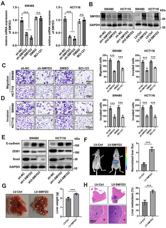 SMYD3 drives colorectal cancer cell motility, EMT, and liver metastasis. (A) qPCR showing relative SMYD3 mRNA in SW480 and HCT116 cells transduced with control shRNA (sh-NC) or two independent shRNAs (sh1-SMYD3, sh2-SMYD3). Cells treated with DMSO or the SMYD3 inhibitor BCI-121 are shown for comparison. *** p < 0.001; n.s., not significant. (B) Immunoblot verification of SMYD3 knockdown and lentiviral overexpression (LV-SMYD3); GAPDH, loading control. (C) Transwell migration assay after SMYD3 inhibition. Left: Representative crystal-violet–stained images of migrated SW480 and HCT116 cells in uncoated inserts under sh-NC, sh-SMYD3, DMSO, and BCI-121. Right: Quantification of migrated cells for each condition. Bars show mean ± SEM from ≥3 independent experiments; one-way ANOVA with post hoc multiple comparisons versus the corresponding control (sh-NC or DMSO); *** p < 0.001. Scale bars, 200 μm. (D) Matrigel invasion assay after SMYD3 inhibition. Left: Representative images of invaded SW480 and HCT116 cells in Matrigel-coated inserts under sh-NC, sh-SMYD3, DMSO, and BCI-121. Right: Quantification of invaded cells. *** p < 0.001. Scale bars, 200 μm. (E) Western blot analysis of epithelial–mesenchymal transition (EMT) markers after SMYD3 knockdown in SW480 and HCT116 cells. Two independent shRNAs (sh1-SMYD3, sh2-SMYD3) increase E-cadherin and reduce ZEB1 and Snail compared with the sh-NC. GAPDH serves as the loading control. (F) In vivo bioluminescence imaging (BLI) in an experimental liver-colonization model comparing LV-Ctrl and LV-SMYD3 groups. Left, representative BLI images; right, quantification of normalized liver ROI photon flux. Dots denote individual mice (n = 5 per group); bars = mean ± SEM; two-tailed Student’s t test, *** p < 0.001. (G) Representative gross livers and corresponding liver weights from the mice in (F); mean ± SEM, *** p < 0.001. (H) H&E staining of liver sections showing metastatic nodules (T) adjacent to normal parenchyma (N). Right, quantification of the metastatic area (%); *** p < 0.001. Scale bars, 200 μm.