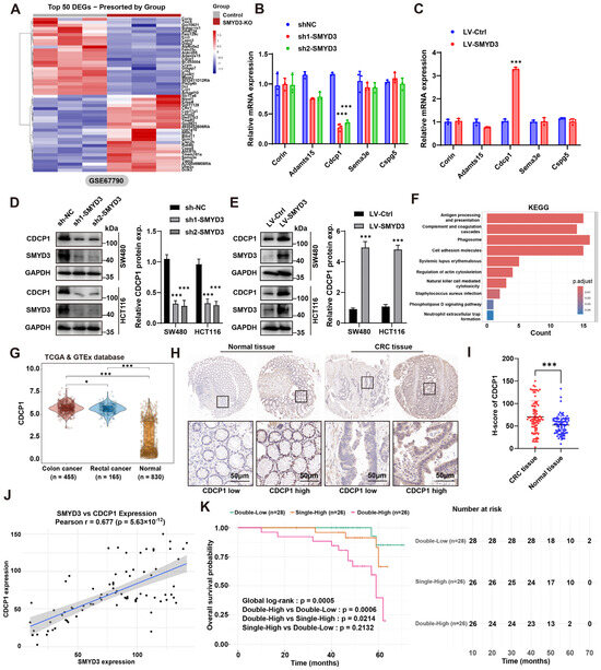 SMYD3 upregulates CDCP1 and their co-expression predicts adverse prognosis in colorectal cancer. (A) Heatmap of the top 50 differentially expressed genes between SMYD3-KO and control cells from GSE67790, showing a distinct SMYD3-dependent signature. (B) qPCR validation of candidate transcripts in SW480 and HCT116 after SMYD3 knockdown (sh1-SMYD3, sh2-SMYD3) versus sh-NC. CDCP1 is strongly reduced; other candidates show minimal change. *** p < 0.001. (C) qPCR showing increased CDCP1 mRNA following lentiviral SMYD3 overexpression relative to LV-Ctrl. *** p < 0.001. (D) Immunoblot of CDCP1 and SMYD3 after knockdown in SW480 and HCT116; GAPDH, loading control. Right, densitometric quantification of CDCP1 protein (mean ± SEM); *** p < 0.001. (E) Immunoblot verifying upregulation of CDCP1 protein upon SMYD3 overexpression; quantification shown on the right; *** p < 0.001. (F) KEGG enrichment analysis of SMYD3-regulated genes highlighting pathways related to immune interaction and cell movement (e.g., antigen presentation, phagosome, ECM–receptor interaction, cell-adhesion molecules, regulation of actin cytoskeleton). Bar color indicates adjusted p. (G) Violin plots of CDCP1 expression in TCGA/GTEx cohorts: colon cancer (n = 455) and rectal cancer (n = 165) versus normal colorectal tissues (n = 830). * p < 0.05, *** p < 0.001. (H) Representative IHC for CDCP1 in normal colorectal mucosa and CRC tissues, illustrating low and high expression. Black squares mark regions shown at higher magnification below. Scale bars: 50 μm. (I) H-score comparison showing higher CDCP1 in CRC versus normal tissues, *** p < 0.001. (J) Positive correlation between SMYD3 and CDCP1 expression across CRC samples; Pearson r = 0.677, p = 5.63 × 10−12. (K) Kaplan–Meier overall survival by combined SMYD3/CDCP1 expression: Patients were stratified into three groups according to SMYD3 and CDCP1 expression: Double-Low (n = 28), Single-High (n = 26), and Double-High (n = 26). The overall survival was significantly different among the groups (global log-rank p = 0.0005). Pairwise comparisons indicated that the Double-High group had markedly poorer survival than the Double-Low (p = 0.0006) and Single-High (p = 0.0214) groups, whereas there was no significant difference between Single-High and Double-Low (p = 0.2132). Numbers at risk are shown below the survival curves.