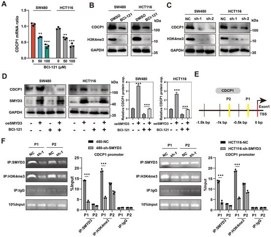 To determine whether SMYD3 catalytic activity is required for CDCP1 upregulation, we performed an epistasis experiment. Lentiviral SMYD3 overexpression markedly increased CDCP1 protein in both models; co-treatment with BCI-121 attenuated this induction, returning CDCP1 to near-baseline levels (one-way ANOVA, p < 0.001; Figure 4D). These data indicate that the methyltransferase activity of SMYD3 is necessary for its positive regulation of CDCP1.