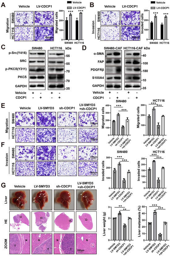 CDCP1 is a functional effector of SMYD3 that augments motility, activates protumor fibroblasts, and is required for liver colonization. (A) Representative Transwell migration images (left) and quantification (right) for SW480 and HCT116 transduced with vehicle or LV-CDCP1. *** p < 0.001. Scale bars, 200 μm. (B) Representative Matrigel invasion images (left) and quantification (right) under the same conditions as in (A). *** p < 0.001. Scale bars, 200 μm. (C) Immunoblots showing increased phosphorylation of Src (Y416) and PKCδ (Y311) upon CDCP1 overexpression; total SRC/PKCδ and GAPDH serve as controls. (D) Immunoblots of CAFs co-cultured with SW480 or HCT116 cells ± CDCP1 overexpression, demonstrating elevated α-SMA, FAP, PDGFRβ, and S100A4 in the CDCP1-high condition. (E,F) Transwell assays in SW480 and HCT116: migration (E) and invasion (F) for vehicle, LV-SMYD3, sh-CDCP1, and LV-SMYD3 + sh-CDCP1 groups. SMYD3 overexpression increases motility, which is blunted by CDCP1 silencing. Mean ± SEM (n ≥ 3); one-way ANOVA with post hoc testing, *** p < 0.001. Scale bars, 200 μm. (G) In vivo liver metastasis model comparing vehicle, LV-SMYD3, sh-CDCP1, and LV-SMYD3 + sh-CDCP1. Top, gross livers; middle, H&E sections with boxed regions magnified below (T, tumor; N, normal). Right, quantification of liver weight and metastatic area (%). ** p < 0.01, *** p < 0.001. Scale bars, 200 μm.