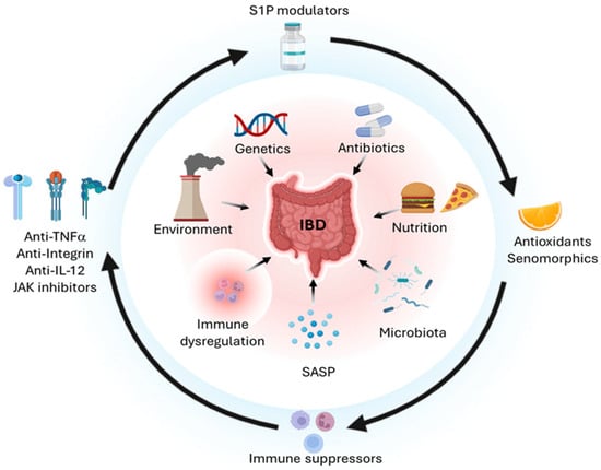 Pathogenetic mechanisms of IBD and targeted therapies. IBD arises from convergent environmental, genetic, drug-related, nutritional, microbiological, inflammatory, senescence-associated, and immunological drivers (inner circle). Corresponding targeted interventions, including anti-cytokines, JAK inhibitors, S1P modulators, antioxidants, senomorphics, and immunosuppressants, may exert beneficial effects on both the intestinal epithelium and the immune compartment (outer circle). Created in BioRender. Bezzerri, V. (2025) https://BioRender.com/4xmb2fm.