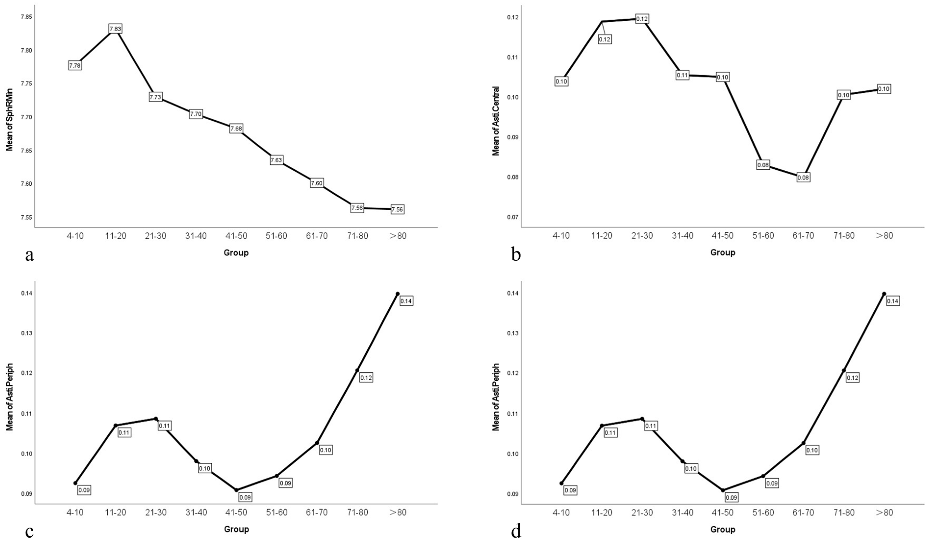 Figure 1. (a) Broken line chart of SphRMin with age in normal eyes; (b) Broken line chart of Asti.Central with age in normal eyes; (c) Broken line chart of Asti.Periph with age in normal eyes; (d) Broken line chart of Irregul with age in normal eyes. SphRMin: the spherical component, which displays the arithmetic mean of all radii of curvature for each ring at 3.0 mm, 5.0 mm, and 7.0 mm; Asti.Central was defined as regular astigmatism at the cornea center 3.5 mm. Asti.Periph was defined as regular astigmatism ranging from 3.5 mm to 7.0 mm around the cornea. Irregul was defined as irregularities that cannot be corrected by a sphere, cylinder, or prism.