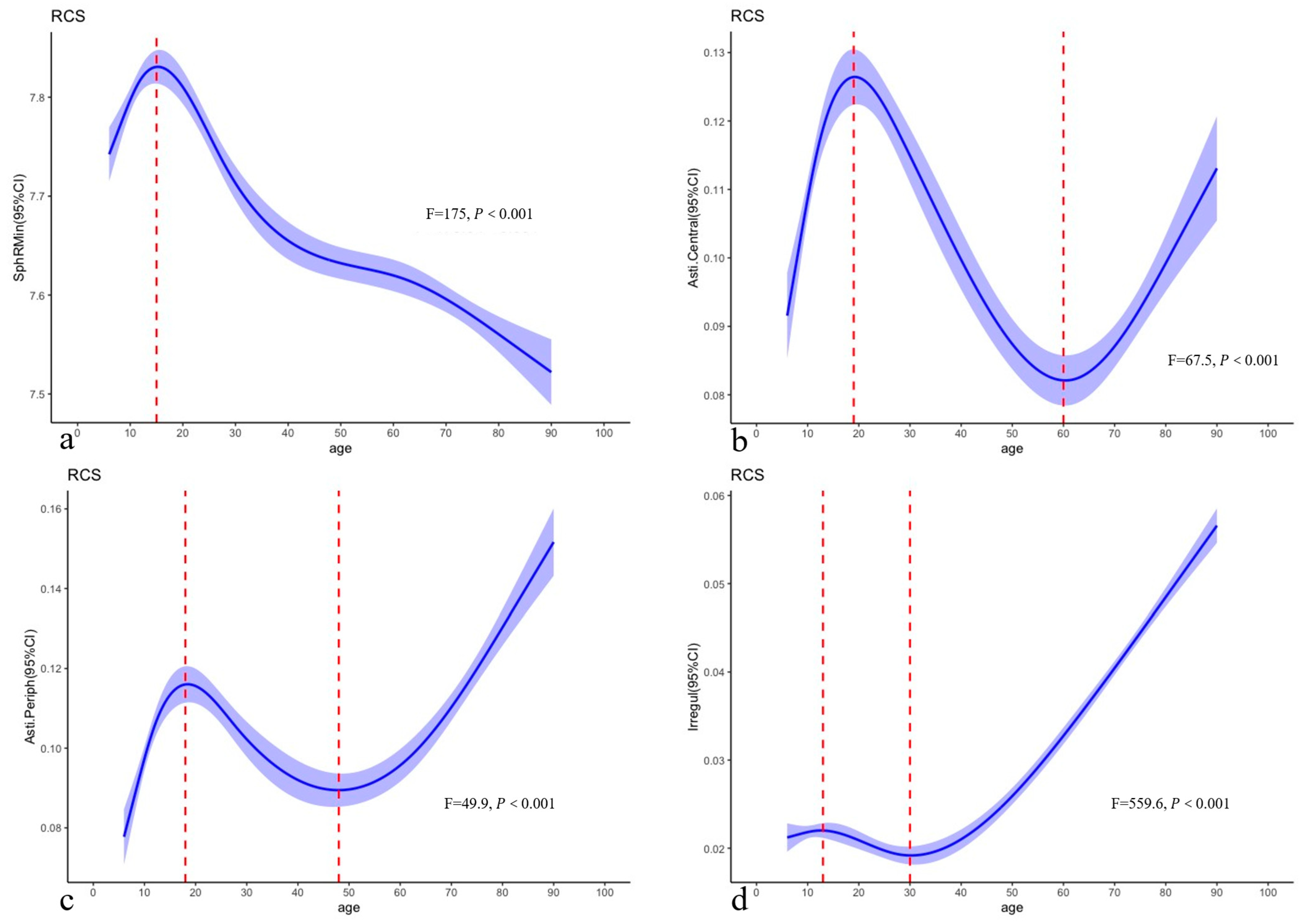 Restricted cubic splines of SphRMin showed that SphRMin increases before 15 years and decreases after 15 years. At 15 years, the corresponding SphRMin value was 7.84 (95% CI: 7.77–7.89) (F = 175.0; p for nonlinearity < 0.001; Padj for nonlinearity < 0.005) (Figure 3). Restricted cubic splines of Asti.Central showed that it increases up to 19 years, decreases between 19 and 60 years, and then increases again after 60 years (F = 67.5; p for nonlinearity < 0.001; Padj for nonlinearity < 0.005). The corresponding Asti.Central values are 0.13 (95% CI: 0.12–0.13) at 19 years and 0.082 (95% CI: 0.078–0.086) at 60 years. Restricted cubic splines of Asti.Periph showed that Asti.Periph increased up to 18 years, decreased from 18 to 48 years, and then increased again after 48 years (F = 49.9; p for nonlinearity < 0.001; Padj for nonlinearity < 0.005). At 18 years, the corresponding Asti.Periph value was 0.12 (95% CI: 0.11–0.12); at 48 years, it was 0.089 (95% CI: 0.083–0.095). Restricted cubic splines of Irregul showed that Irregul increased up to 13 years, decreased from 13 to 30 years, and then increased again after 30 years (F = 559.6; p for nonlinearity < 0.001; Padj for nonlinearity < 0.005). At 13 years, the corresponding Irregul value was 0.022 (95% confidence interval [95%CI]: 0.021–0.023); at 30 years, it was 0.019 (95%CI: 0.018–0.020).