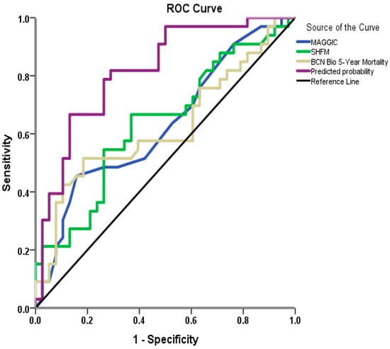 In the ROC curve analysis, the AUC values for the three risk models were as follows: MAGGIC at 0.630 (p = 0.061), SHFM at 0.636 (p = 0.05), and BCN Bio-HF at 0.622 (p = 0.078). The comparison of the AUCs of the three risk scores did not reveal any significant difference between these scores (p > 0.05 for all comparisons). Based on the univariable analysis, a multivariable logistic regression analysis was performed, and a predictive model that incorporated the independent predictors of 30-month mortality (Table 7) presented a predictive accuracy AUC = 0.817 (p < 0.001) (Figure 2). The AUC of the current model was significantly higher compared to MAGGIC (p = 0.025), SHFM (p = 0.03), and BCN Bio-HF (p = 0.022).