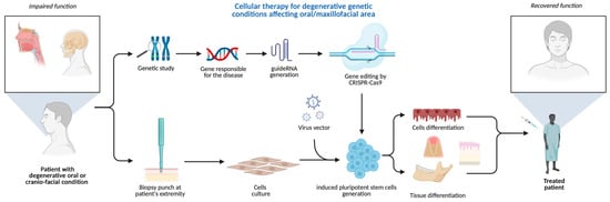 CRISPR-based cellular therapy for inherited conditions manifesting in oral/maxillofacial areas. Created in BioRender. Dziedzic, A. (2025) https://BioRender.com/h980ant (accessed on 5 August 2025).