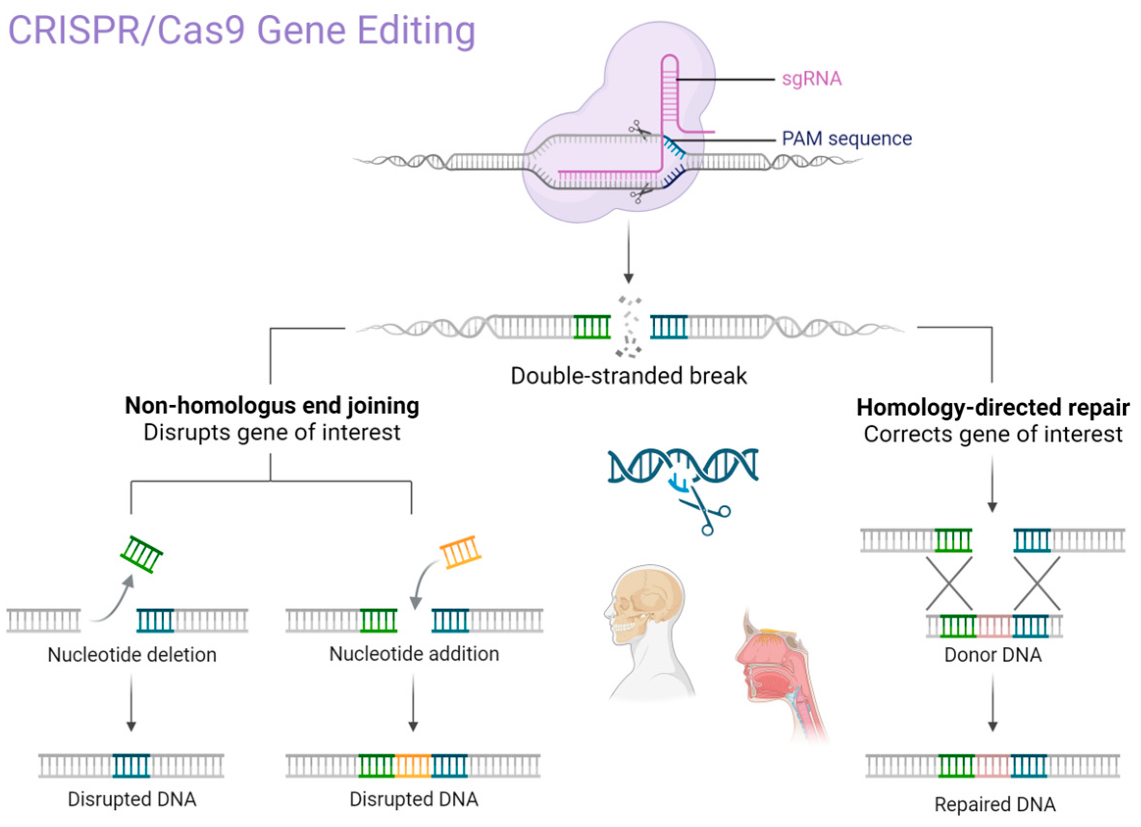 The primary mechanism of CRISPR/Cas9 gene editing technology. Created in BioRender. Dziedzic, A. (2025) https://BioRender.com/p62u5m9 (accessed on 1 February 2025).