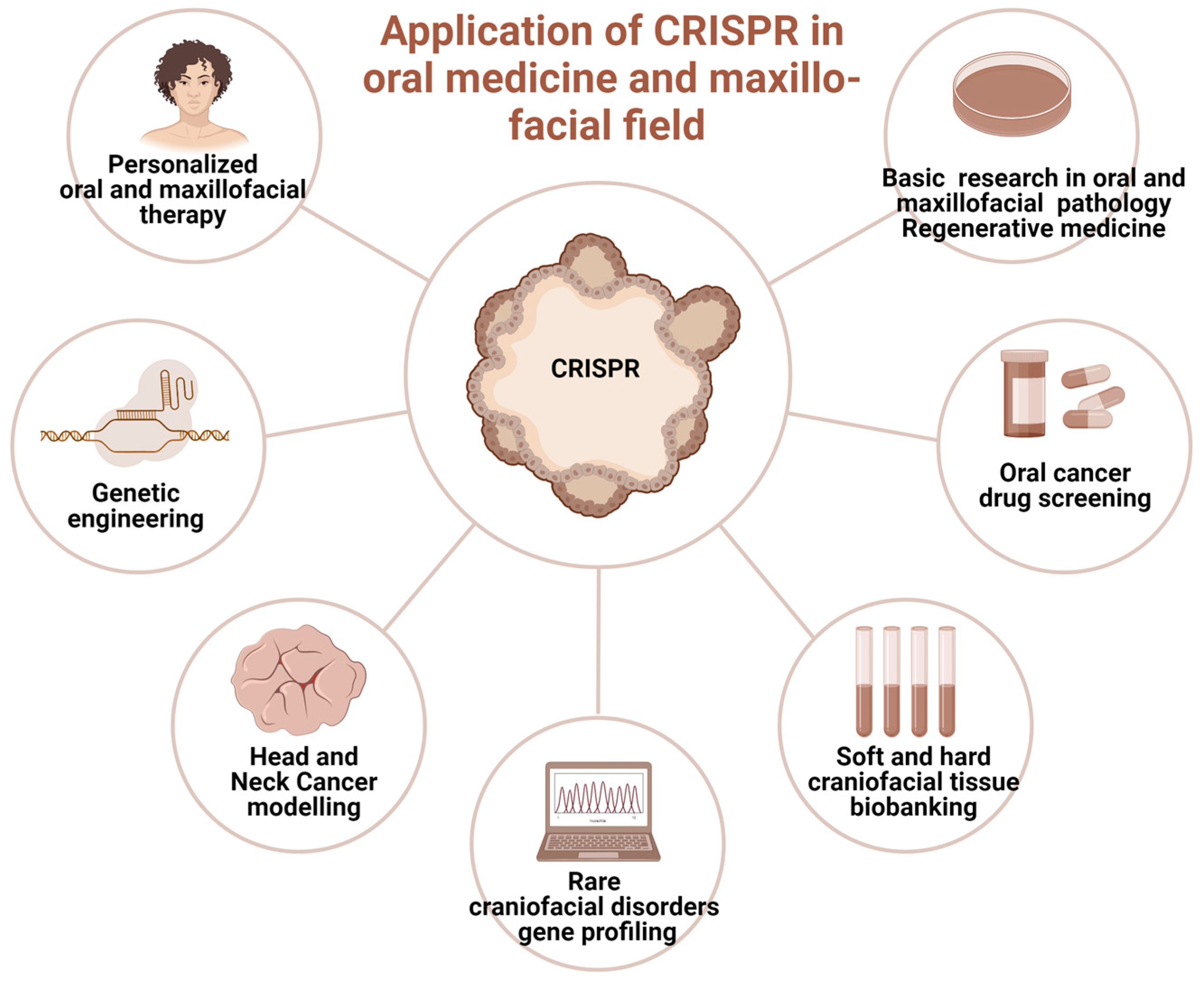 The prospective clinical applications of CRISPR genome-editing bioengineering in oral medicine and maxillofacial fields. Created in BioRender. Dziedzic, A. (2025) https://BioRender.com/6jtf5z8 (accessed on 1 January 2025).