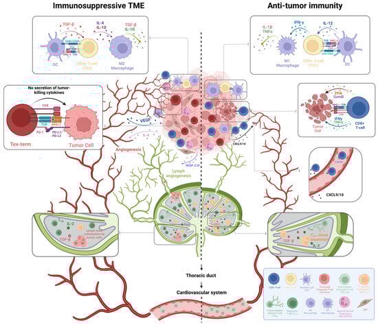 A comparison between an immunosuppressive TME versus anti-tumor immunity. Some properties are evident in anti-tumor immunity responses: Decreased inhibitory receptors expression on T-cells and terminally exhausted T-cells (Tex-term) count in TME, effective infiltration of cytotoxic T-cells and M1 macrophages in TME, which is associated with cytotoxicity and anti-tumor immunity, lack of myeloid-derived suppressor cells (MDSCs) infiltration in TME, decreased angiogenesis, CD4+ helper T-cells differentiating into Th1 cells, increased levels of IL-12, IFN-γ, IL-1b, TNF-α and, granzyme B (GzmB), increased progenitor exhausted T-cells (Tpex) proliferation in TDLNs, increased IL-2 level in TDLNs, increased tissue-resident memory T-cells (TRM) in TDLNs, decreased regulatory T-cells (Tregs) count in TDLNs, and increased intermediate exhausted T-cells (Tex-int) count in blood circulation. On the other hand, different properties are noticeable in an immunosuppressive TME: increased inhibitory receptors expression, which are abundant on Tex-term, increased angiogenesis, increased MDSCs infiltration in TME, CD4+ helper T-cells differentiating to Th2, high levels of TGF-β, IL-4, IL-6 and IL-10 in TME, tumor-promoting M2 macrophages in TME associated with tissue healing and neoantigen tolerance, increase in Tregs count in TDLNs, decrease in Tpex proliferation and TRM count in TDLNs, decrease in IL-2 level in TDLNs, and decrease in Tex-int cells count in blood circulation (“Created in BioRender. A.A.D. (2025) https://BioRender.com/5gx818o, accessed on 24 October 2025”).