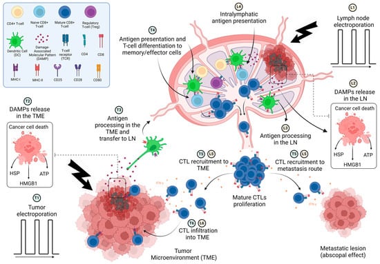 Chain of possible immune-related events happening in concurrent tumor- TDLN DAMPs induction by ECT. ‘L’ is the term used for immune-related events initiated from TDLNs ECT, and ‘T’ refers to tumor-related ECT events. TDLNs ECT (L1) results in DAMPs’ release in the TDLN environment (L2), in close contact with immature immune cells. Both antigen encounter (L3) and presentation to naïve T-cells via APCs are performed within the TDLN in the presence of CD4+ helper T-cells, leading to production of mature Cytotoxic T lymphocytes (CTLs) (L4). CTL recruitment to the TME and metastasis route (abscopal effect) is then performed (L5, L6). On the other hand, tumor cell ECT (T1) leads to DAMPs production in the TME (T2), which promotes APCs migration to TME and antigen processing (T3). T-cell differentiation to CTLs is subsequently performed in the TDLNs environment in the presence of helper T-cells, leading to clonal expansion (T4), CTL recruitment to TME (T5), and infiltration into the tumor core (T6) (Created in BioRender. A.H. (2025) https://BioRender.com/lvx9dit, accessed on 24 October 2025”).