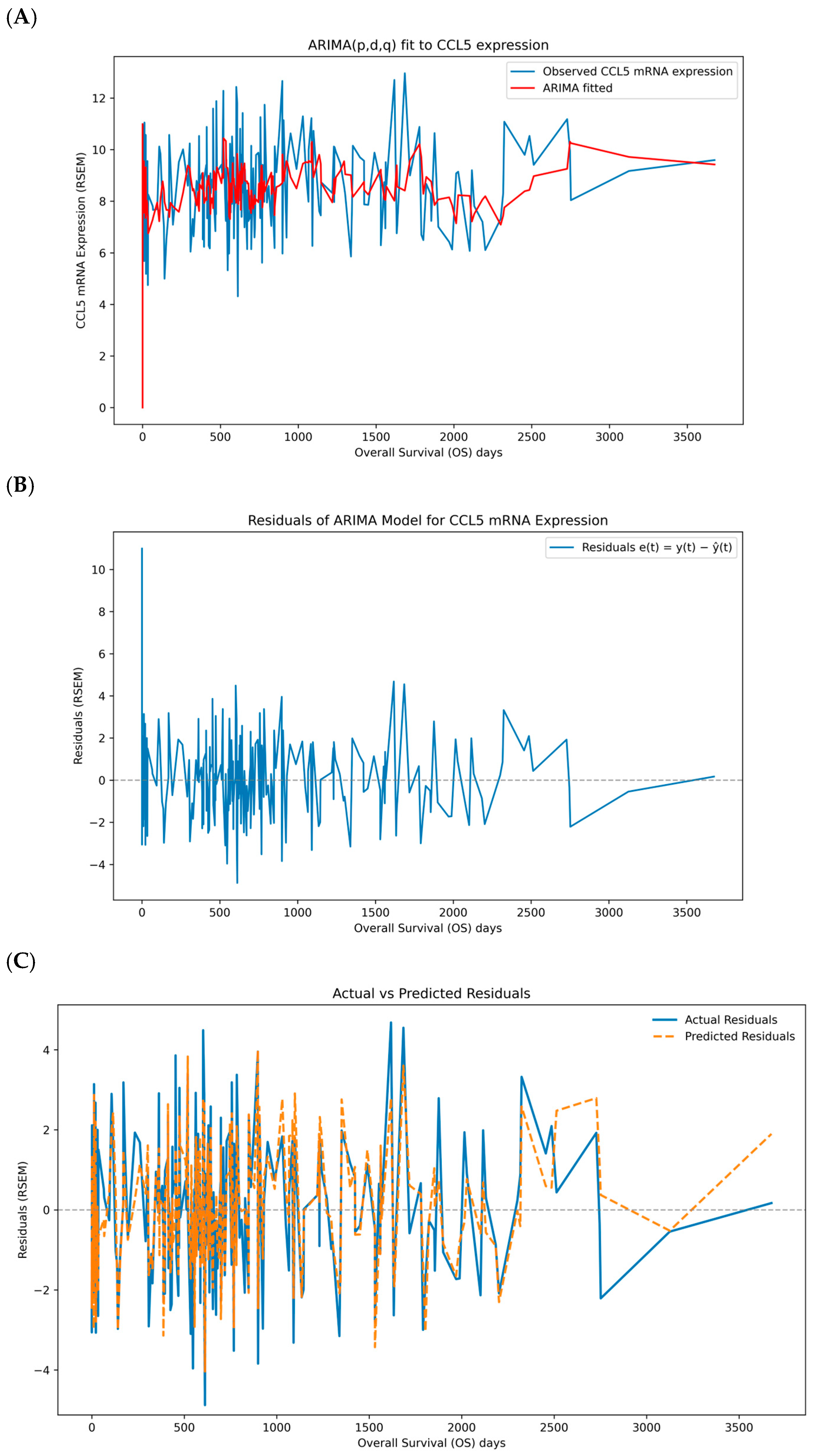 The following supporting information can be downloaded at: https://www.mdpi.com/article/10.3390/biomedicines13112751/s1, Figure S1: The non-parametric correlation analysis between CCL5 expression and various immune cells; Figure S2: Kaplan-Meier Survival Curve and Cox Regression Analysis for CCL5-ARIMA CD8 T cells CNN-Extracted Features; Figure S3: Overview of the ARIMA-CNN prognostic framework; Table S1: Diagnostic Tests; Table S2: Median Split Analysis of Single Gene; Table S3: CCL5-ARIMA-CNN Extracted Features of Single Gene; Table S4: Hyperparameters and Implementation Details of the Proposed ARIMA-CNN Prognostic Framework; Table S5: Univariate FDR results.