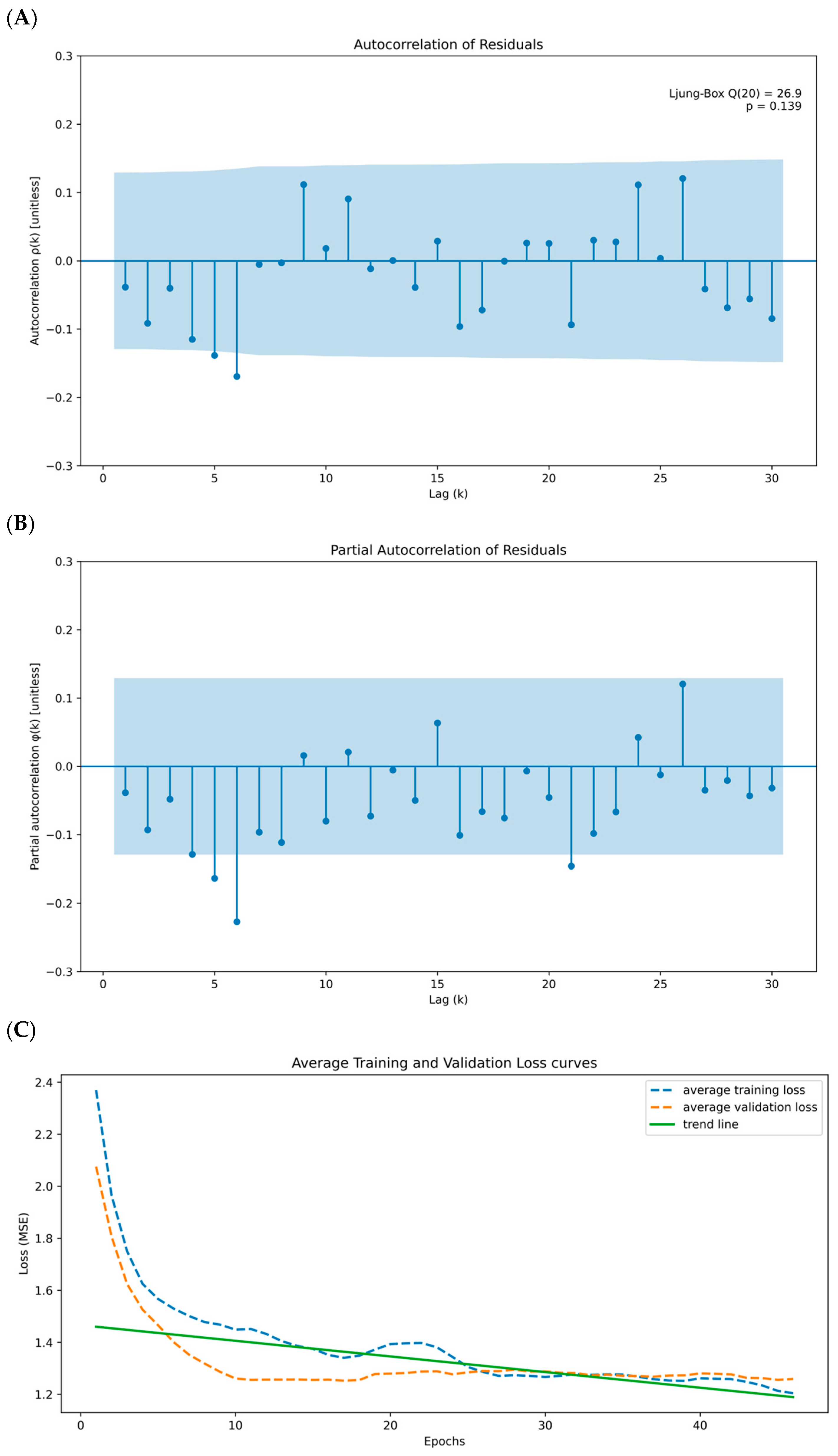 Residual diagnostics and learning curves for the ARIMA-CNN on CCL5. (A) Autocorrelation function of ARIMA residuals with 95% confidence bands; most bars lie within the bands and the annotated Ljung–Box Q (20) = 26.9, p = 0.139 supports no remaining autocorrelation. The x-axis is lag k; the y-axis is autocorrelation ρ(k) (unitless). (B) Partial autocorrelation function of residuals with 95% confidence bands; no material partial autocorrelations across lags. The x-axis is lag k; the y-axis is partial autocorrelation ϕ(k) (unitless). (C) Mean training and validation loss across epochs with a linear trend line summarizing the overall decline; the small and stable gap between curves indicates limited overfitting. The x-axis is epochs; the y-axis is loss (MSE, Mean Squared Error).