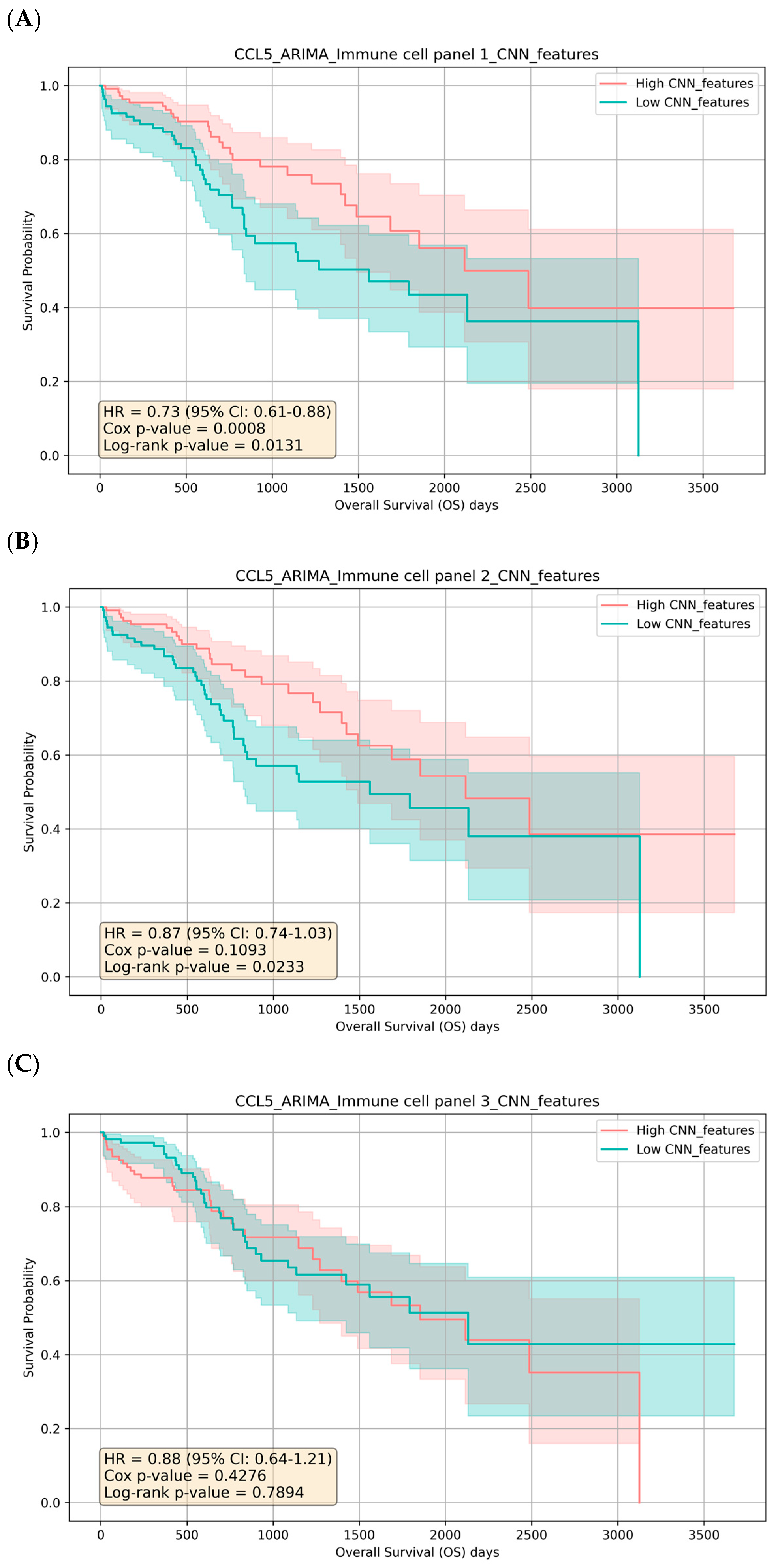 To evaluate the ARIMA-CNN model’s predictive power and stratification capability, Kaplan–Meier survival curves were analyzed and stratified based on the median expression levels of CCL5, the expression levels of other immune cells, and the CNN-extracted features derived from the CCL5-ARIMA model residuals. This analysis highlights the comparative performance of traditional median-based stratification versus CNN-enhanced feature extraction in predicting survival outcomes. The median split analysis of single genes revealed significant survival associations for specific immune gene signatures, including B cells, Th1 cells, CD8 T cells, and Tregs. These findings highlight the potential prognostic value of individual immune gene expressions when stratified by their median expression levels (Table S3). In contrast, the CNN-based feature extraction method, leveraging CCL5-ARIMA residuals, revealed a consistent trend of reduced hazard ratios (HR), indicating a stronger protective effect compared to the median split analysis. For instance, the HR for CD8 T cells decreased from 0.8037 to 0.7654, and for Th1 cells from 0.7485 to 0.7720 (Table S4). These reduced hazard ratios highlight the ability of the CNN model to effectively capture complex, non-linear patterns in the data, which are not apparent in traditional stratification methods. Furthermore, the CNN-extracted features demonstrated that CCL5 and its associated immune gene signatures, such as CD8 T cells and Th1 cells, synergistically influence patient outcomes by providing a more nuanced representation of survival-related features. Herein, this finding underscores the model’s ability to integrate interactions between multiple immune gene expressions, offering a comprehensive understanding of their prognostic value and surpassing the predictive capability of traditional single-gene median split approaches.