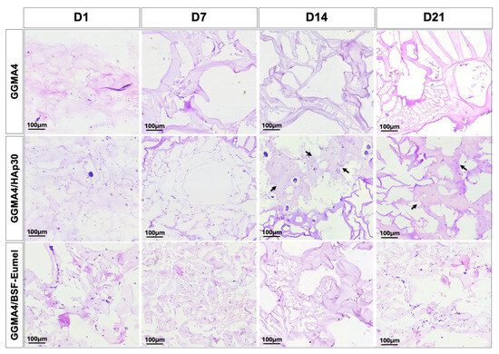 The results confirmed that hADMSCs adhered to and infiltrated all scaffold types (GGMA4, GGMA4/HAp30, and GGMA4/BSF-Eumel). However, cell density was notably greater in GGMA4/HAp30 and GGMA4/BSF-Eumel across all time points compared to the neat GGMA scaffold, suggesting enhanced cellular recruitment and retention induced by scaffold functionalization. At Days 14 and 21, GGMA4/HAp30 exhibited histological evidence of bone-like matrix deposition, indicated by the presence of organized areas and structural signs characteristic of osteogenic progression (black arrows, Figure 3). This feature was not observed in either GGMA4 or GGMA4/BSF-Eumel scaffolds, suggesting that HAp plays a critical role in promoting early mineralization and bone matrix formation.