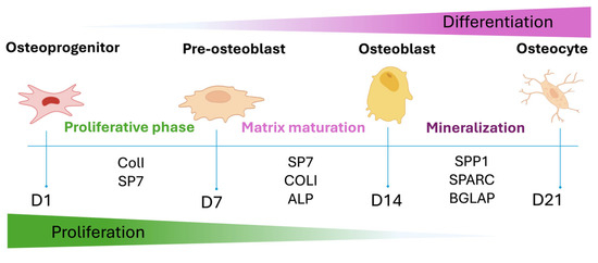 Graphical representation of the osteogenic differentiation of hADMSCs and the most important osteogenic markers expressed during the different phases.