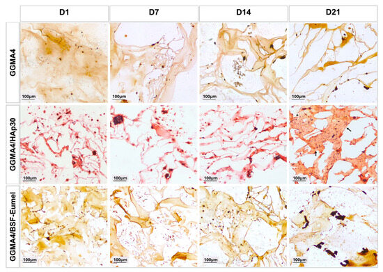 Alizarin Red S (ARS) staining was used to assess calcium deposition and ECM calcification over time. As shown in Figure 6, all scaffold types revealed progressive mineralization from Day 1 to Day 21. Particularly, GGMA4/HAp30 and GGMA4/BSF-Eumel scaffolds exhibited significantly higher levels of mineral deposition compared to the neat GGMA4, as indicated by the presence of dense red-brown extracellular calcium aggregates visible in the Alizarin Red S-stained sections. By Day 21, GGMA4/HAp30 scaffolds showed histological features resembling bone-like tissue (indicated by black arrows), a response not visible in GGMA4 and GGMA4/BSF-Eumel scaffolds.