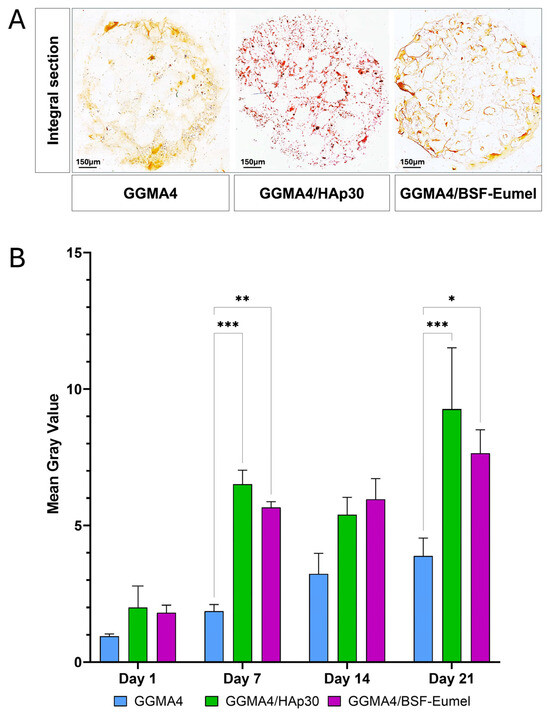 The MTT assay results confirmed that all scaffolds tested, GGMA4, GGMA4/HAp30, and GGMA4/BSF-Eumel, were cytocompatible and non-cytotoxic, with comparable cell viability observed across all different biomaterials at Day 1. From Day 7 onward, however, some differences emerged: GGMA4/BSF-Eumel exhibited the most significant increase in cell viability, compared to both GGMA4 and GGMA4/HAp30, particularly by Day 21. GGMA4/HAp30 also enhanced cell viability compared to neat GGMA4 (control), although its effect was less significant than that of the BSF-Eumel scaffold (Figure 2).