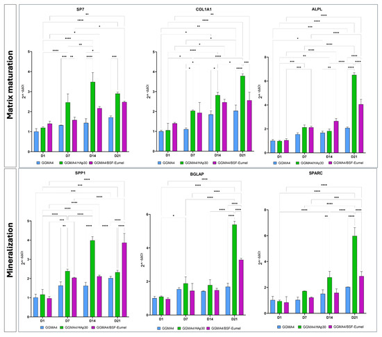 Gene expression profile of hADMSCs cultured on GGMA4, GGMA4/HAp30, and GGMA4/BSF-Eumel for 21 days performed with specific early and late markers of osteogenic differentiation: SP7, COL1A1, ALPL, SPP1, BGLAP and SPARC. GAPDH was used as an endogenous control. Statistical significance was determined by two-way ANOVA with Tukey’s post hoc test. The symbols denote: * p < 0.05, ** p < 0.01, *** p < 0.001, and **** p < 0.0001.