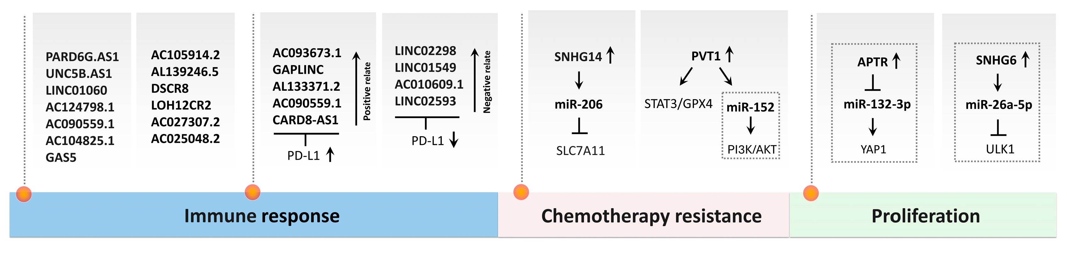 | AC093673.1 | upregulated | positively correlated with PD-L1 → promote immune evasion | in silico | [243] |