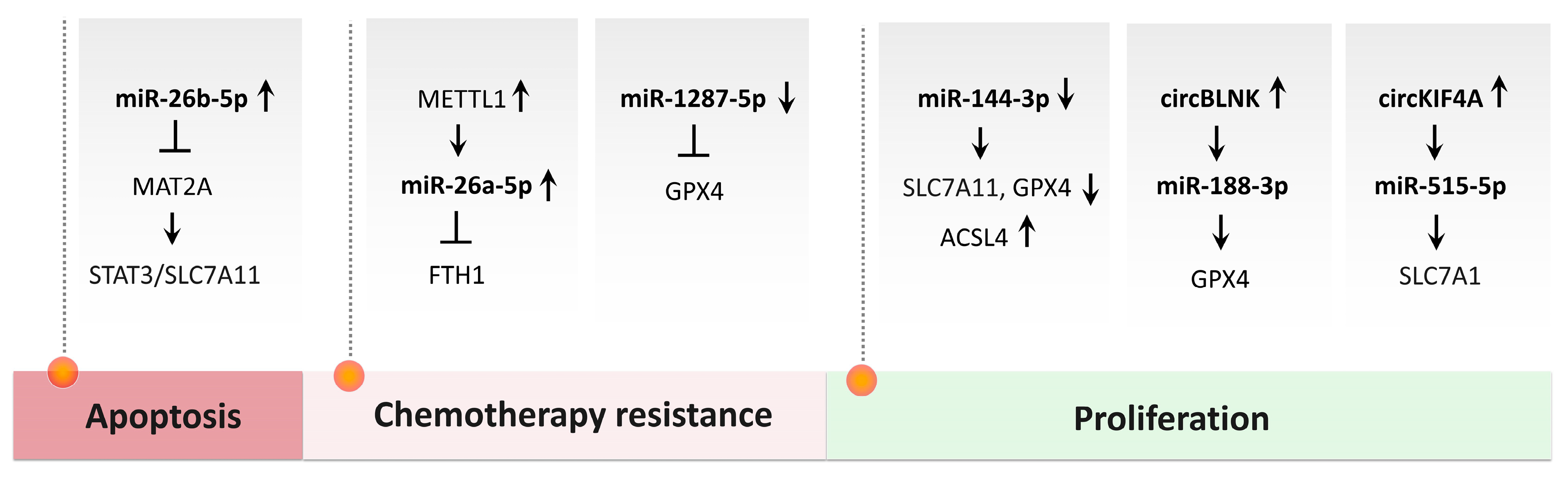 | miR-26a-5p | upregulated | promotes ferroptosis via ↓ FTH1; increases sensitivity to cisplatin/doxorubicin; regulated by METTL1, which enhances miR-26a/FTH1 interaction | U2OS, 143B xenograft | [238] |