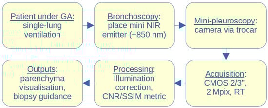 Prototype workflow (see Figure 1): (1) Bronchoscopy to position the mini NIR emitter in the segmental/subsegmental bronchus; (2) a single 5–6 mm pleural port for minipleuroscopy; and (3) real-time acquisition and optional biopsy. In our preclinical setting, the individual steps were short (minutes), and the total imaging time was in the order of tens of minutes. Clinical times will vary with logistics and whether adjunctive biopsy/therapy is performed. A formal time-and-motion analysis will be included in future clinical feasibility studies.