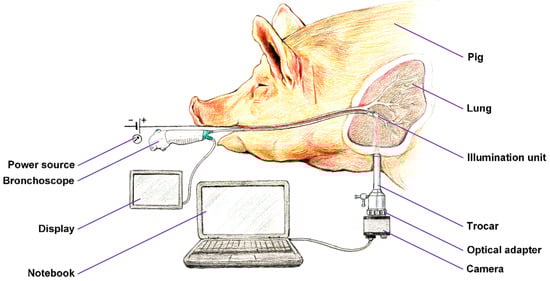 We prepared a framework of the experimental setup, which is shown in Figure 4. A unilateral pneumothorax was induced in a dormant intubated pig, which was spontaneously ventilated. The source of near-infrared radiation (the illumination unit connected to a regulated power source) was introduced into its subsegmental bronchus by means of ticks and under visual inspection with a flexible bronchoscope, which allowed for either a direct view or the use of a connected display. The pig, lying on its side, was subjected to a minipleuroscopy using one port of no more than 6 mm into which the pleuroscope was inserted via a trocar. After a routine inspection of the pleural cavity, the radiation source was then emitted against the distal end of the pleuroscope, which was placed in the correct position for acquisition. Subsequently, a camera was installed on the output optics of the pleuroscope which was inserted via a trocar, and after a suitable adjustment of the power of the illumination unit, the radiation penetrating the lung tissue was detected. The real-time video stream was displayed on a notebook. After recording a high-quality video signal of the visualized tissue, the experiment was terminated.