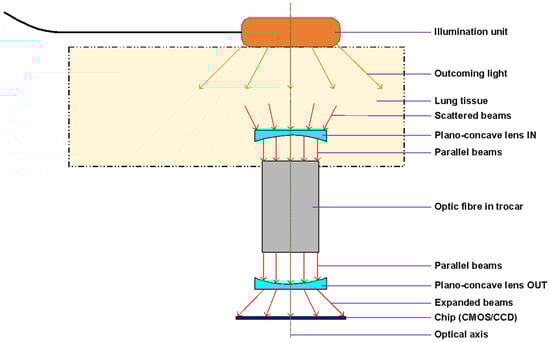 Figure 5 demonstrates the experimental setup, showing the optical principle of lung tissue translumination (transmissive illumination). The principle is based on the use of transmissive illumination, where the infrared light comes out from the illumination unit and is scattered in the lung tissue, which is between the light source (lighting head) and the camera. The plano-concave lens collects part of this scattered light and sends the light to the optic fiber in the trocar or the pleuroscope. For our experiment, instead of a fiber, we used the pleuroscope, which consisted of one or more optic fibers inside. From the optic fibers/pleuroscope, the parallel beams go through to the second plano-concave lens, which expands the beams to the CMOS chip, which acquires the image of the lung tissue. All optical components are centered to the optical axis of the chip.