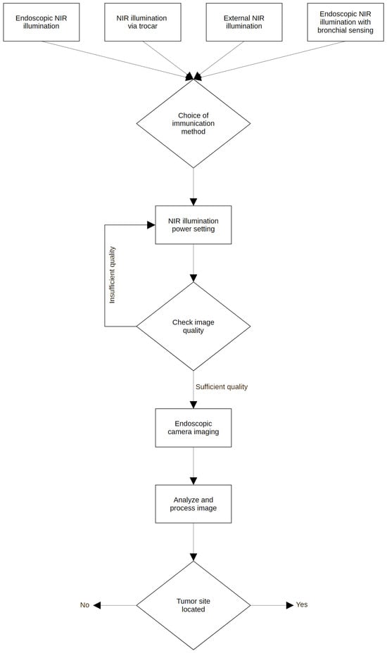 In all cases, the step of NIR illumination power setting follows (see Figure 7), with a default illumination power setting for each lighting method. If the image quality is inadequate, it is necessary to increase (under-illuminated tissue) or decrease (over-illuminated tissue) the power of the light unit. This can be performed either automatically by the software or by the physician, who can adjust the illumination intensity. At the same time, the acquisition parameters of the capture device, typically the camera gain and the exposure time, are also set. This is followed by the connection of the sensor unit, which in our case is the camera connected to the pleuroscope via the optical adapter. Any other type of illumination, based on experimental verification, would not fit the criteria since ambient illumination and the thickness of other tissues strongly degrade the quality of the illuminated tissue displayed. The associated software carries out analysis and image processing, for example, to highlight potential tumor foci or suspicious areas. In obvious cases, the software can evaluate the area as a pathological focus, giving the physician recommendations for findings.
