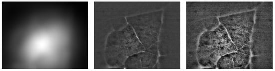 Estimation of the non-uniform illumination field (left), the corrected image (middle), and the image with adaptive histogram correction (right). The images are cropped in order to remove the border effect caused by image filtering. The original image is shown in Figure 8 on the left.
