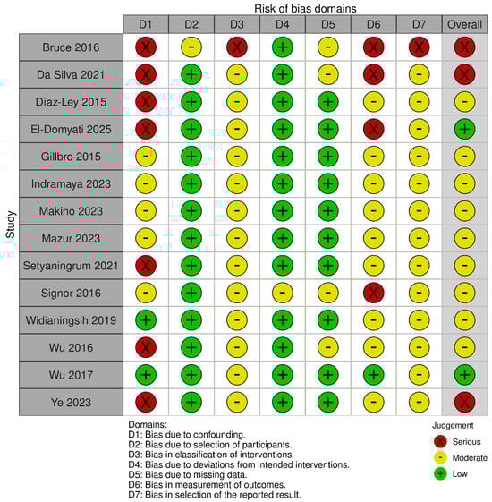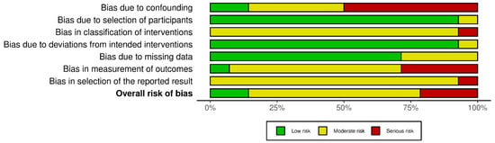 In non-randomized experimental studies, risk of bias was evaluated through the ROBINS-I (Risk of Bias in Non-randomized Studies of Interventions) tool, assessing seven domains, including confounding, selection of participants, classification of interventions, deviations from intended interventions, missing data, outcome measurement, and selection of reported results. Judgments are made across each domain to determine an overall risk of bias rating: “low”, “moderate”, “serious”, “critical”, or “no information” [].