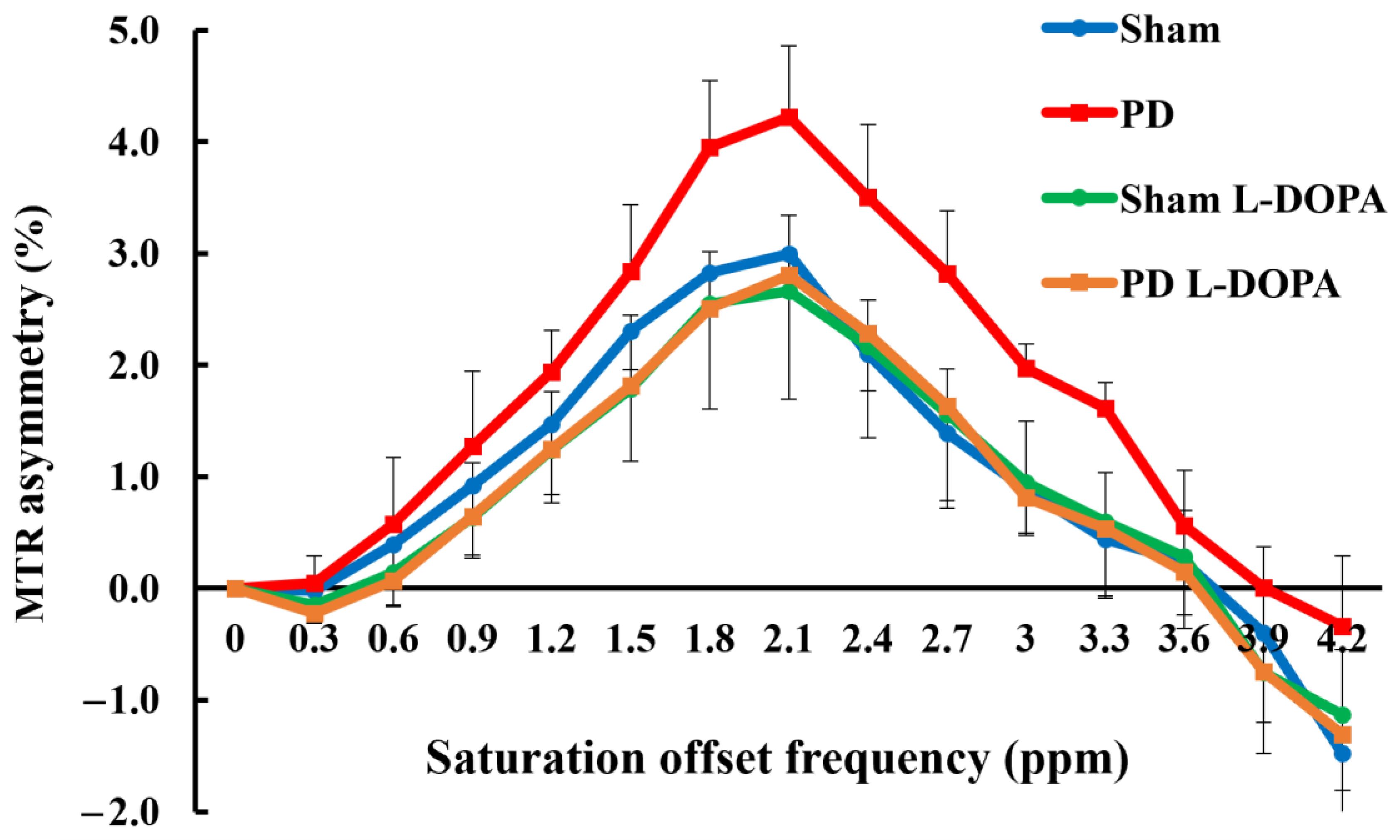 Figure 4. Cumulative MTR asymmetry curves. Comparisons between groups were analyzed using one-way analysis of variance with Tukey’s multiple comparison tests. MTR: magnetization transfer ratio. Sham: Pseudo-treatment model with saline administered to the medial forebrain bundle (n = 6), PD: 6-OHDA-induced unilateral Parkinson’s model rats (n = 6), Sham_L-DOPA: Rats treated with L-DOPA in a pseudo-treatment model in which saline was administered to the medial forebrain bundle (n = 6), PD_L-DOPA: 6-OHDA-induced unilateral Parkinson’s model rats treated with L-DOPA (n = 6).