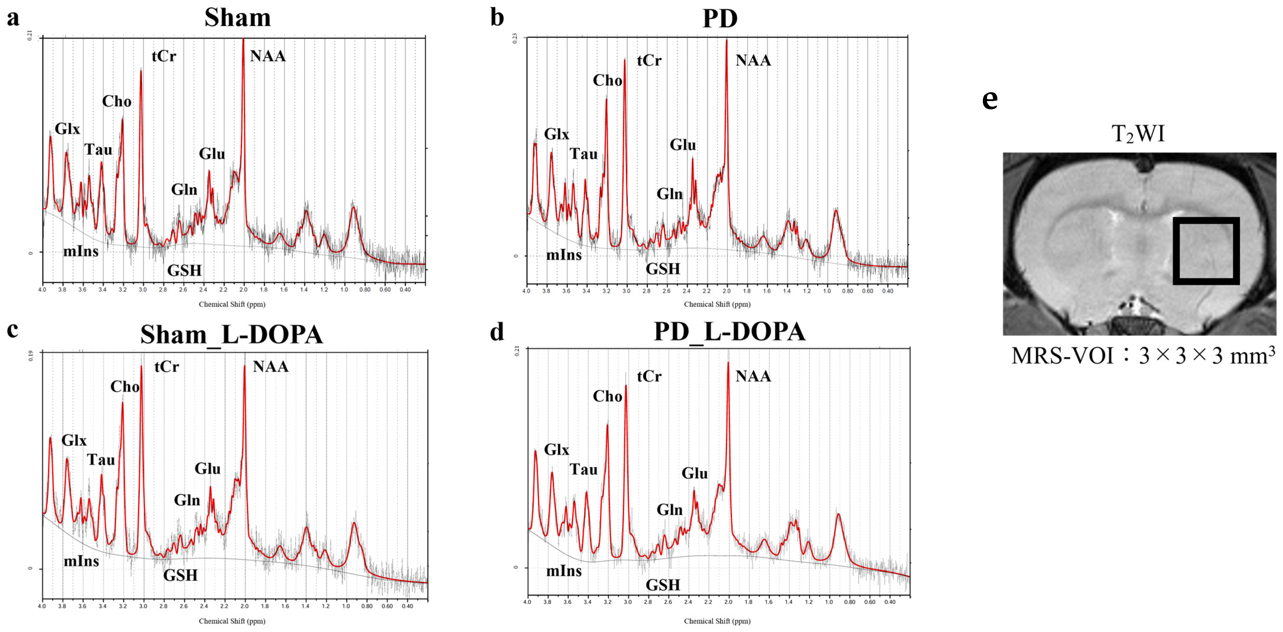 Figure 5. MRS of all groups. (ad) MR spectra measured. (e) T2WI image showing voxel of interest for MRS. Using T2WI images in three orthogonal planes, a 3 × 3 × 3-mm3 volume of interest was positioned within the right striatum. Sham: Pseudo-treatment model with saline administered to the medial forebrain bundle (n = 6), PD: 6-OHDA-induced unilateral Parkinson’s model rat (n = 6), Sham_L-DOPA: Rats treated with L-DOPA in a pseudo-treatment model in which saline was administered to the medial forebrain bundle (n = 6), PD_L-DOPA: 6-OHDA-induced unilateral Parkinson’s model rat treated with L-DOPA (n = 6). MRS: Magnetic resonance spectroscopy.